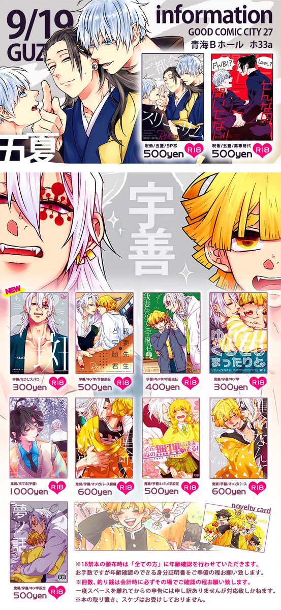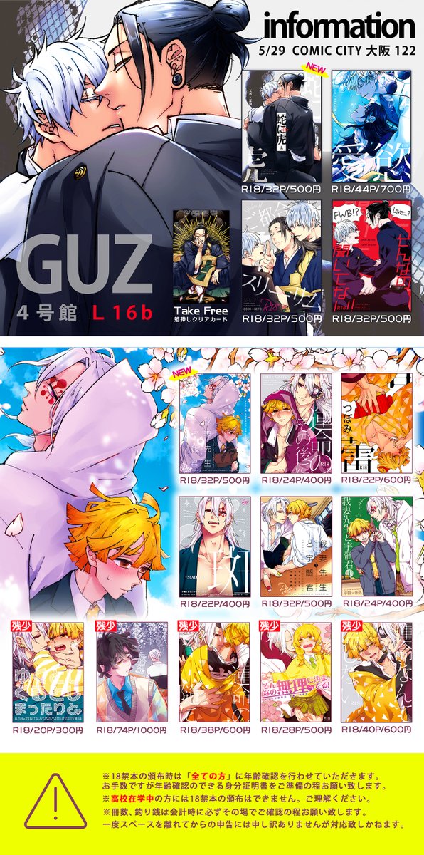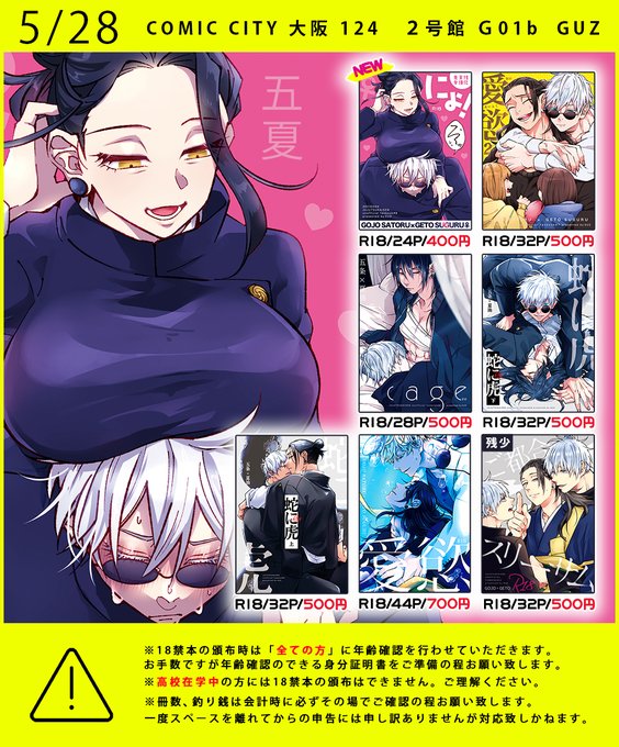 既刊もって久しぶりにインテ遊びに行きます!!参加される方はどうぞよしなに〜!!!! ▼5/28 お品書き【五夏】 pixiv.net/artworks/10843… 5/28 COMIC CITY 大阪 124 妖言 22 → 2号館 G01b GUZ