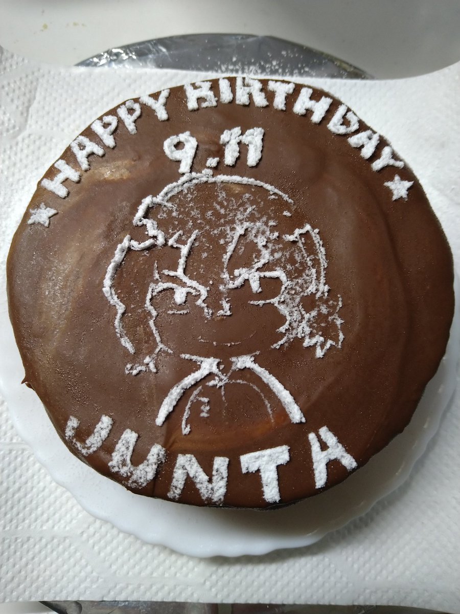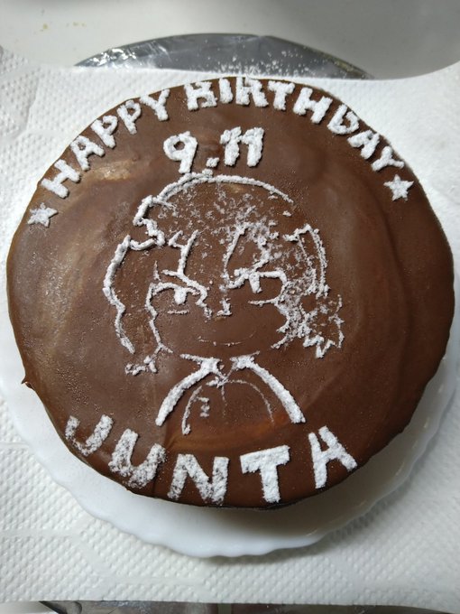 8 52 実は純ちゃんの誕生日ケーキも焼いてたのですが、粉糖で純ちゃんやろって紙を切り抜いてたらこんな時間になってしまったのですが、頑張ったけど微妙な出来になりました……😔 #手嶋純太誕生祭2021 21/09/12 02:00