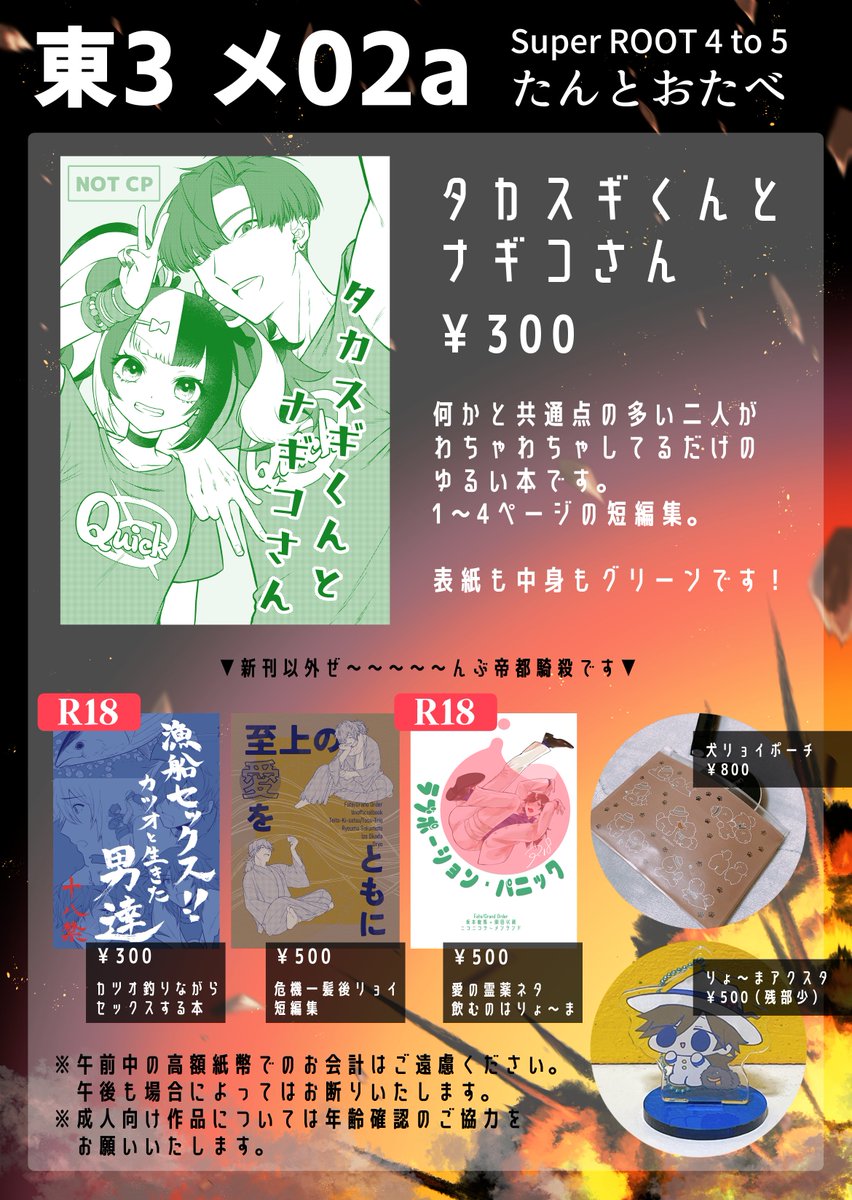 5/3る~しこのおしながきです!!新刊は高杉クンとなぎこさん!!!それ以外全部帝都騎殺!!!!!よろしくお願いします!!!!!!!! (下にサンプル繋げます!!)