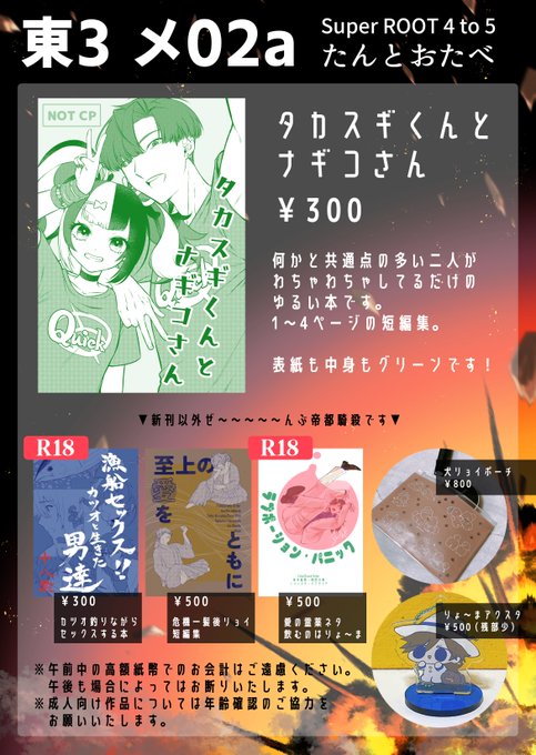 30 41 5/3る~しこのおしながきです!!新刊は高杉クンとなぎこさん!!!それ以外全部帝都騎殺!!!!!よろしくお願いします!!!!!!!! (下にサンプル繋げます!!) 23/04/29 23:45