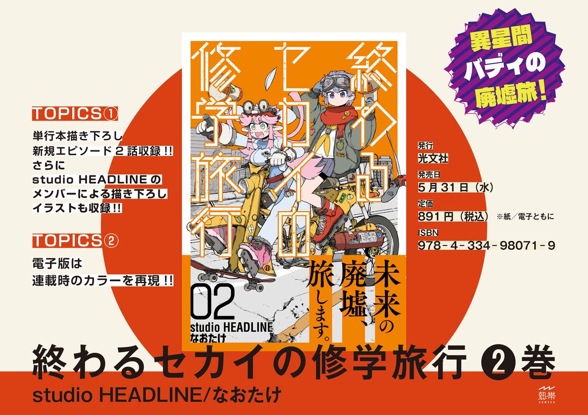 『終わるセカイの修学旅行』第二巻が5月31日発売です。 これまでのお話に加え、 描きおろし漫画も2話分収録。 とても豪華な内容となっておりますので是非ご予約をお願い致します! Amazonさんでのご予約はこちらから amazon.co.jp/dp/4334980716 (※電子書籍版は一部カラー仕様です。)