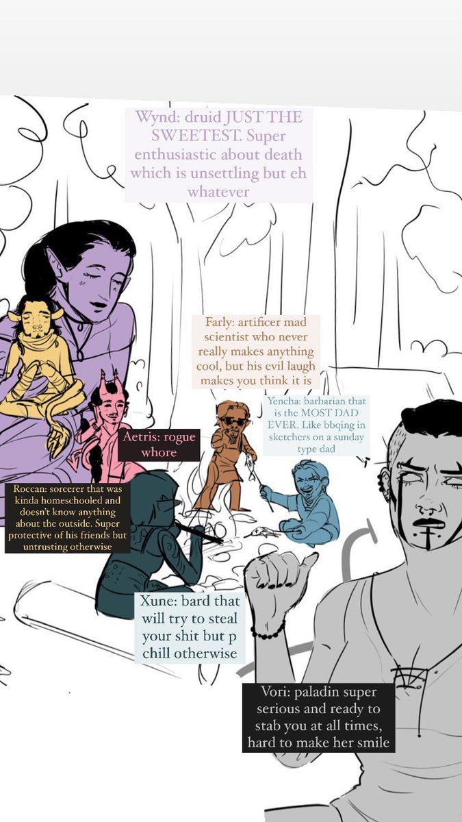 Here are my characters. Reply with a pic of your pc tell me a bit about what they are like and pick one of my bitches so i can draw them hanging out. Plz plz plz. I want to draw someone elses pc so bad aaahashhs #dnd #dndart #letmedrawyourdndcharacterplease
