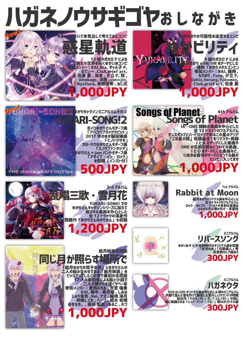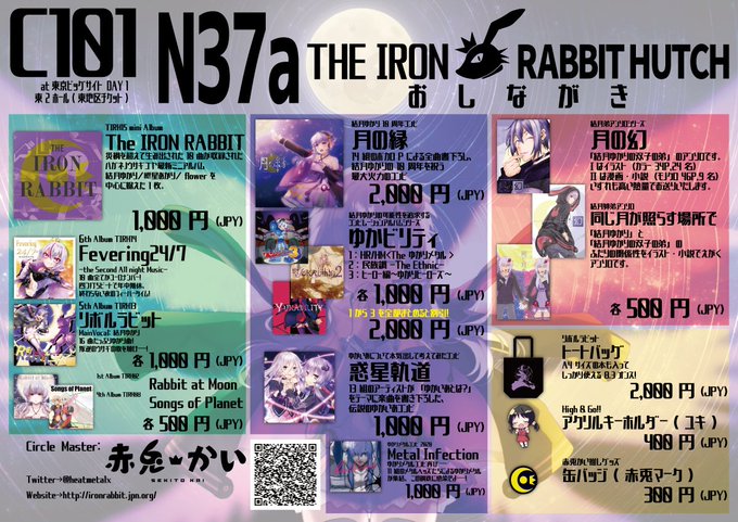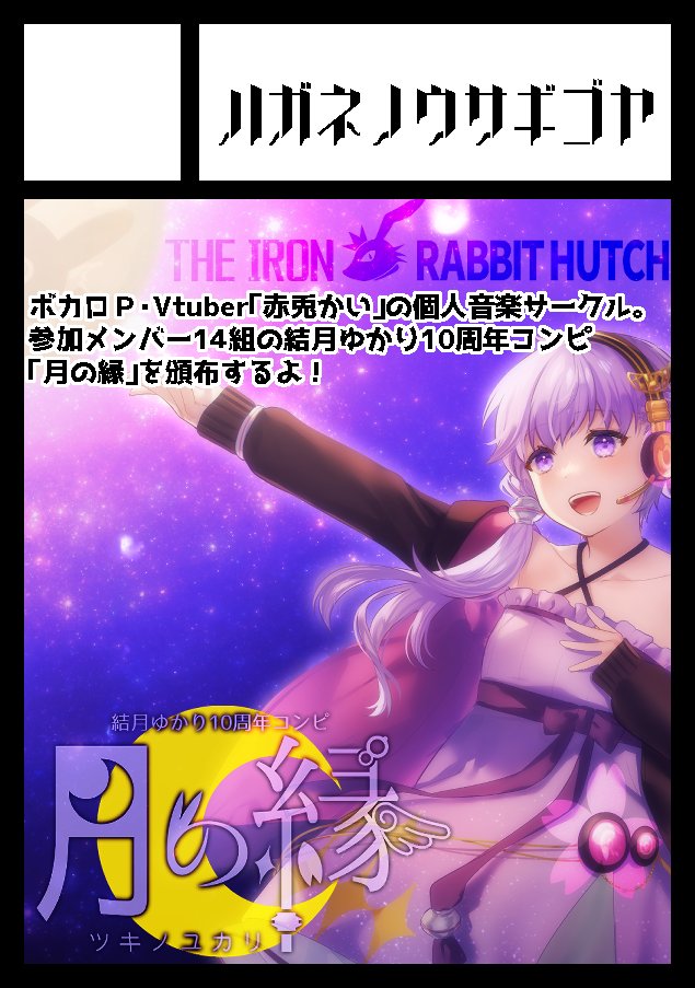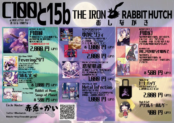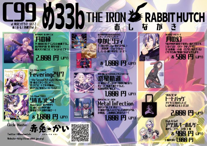 C99お品書き公開です! 12月31日(2日目)の南1ホール、西側チケットエリア めー33b「ハガネノウサギゴヤ」にて 結月ゆかり10周年コンピ「月の縁」が初頒布となります。 会場限定のちょっとしたおまけもご用意してお待ちしております。 webcatalog-free.circle.ms/Circle/15709528 #C99WebCatalog #C99 #C99お品書き twitter.com/heatmetalx/sta…