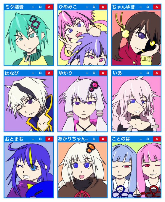 やってみたかったので我が家のメンバーから9枠埋めてみました! いわゆるうちの子設定だから若干一名大幅に見た目が変化してるんだけどあの子トリートメント代がバカにならねぇってこないだまでぼやいてたから…… #合成音声キャラを描こう