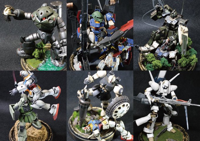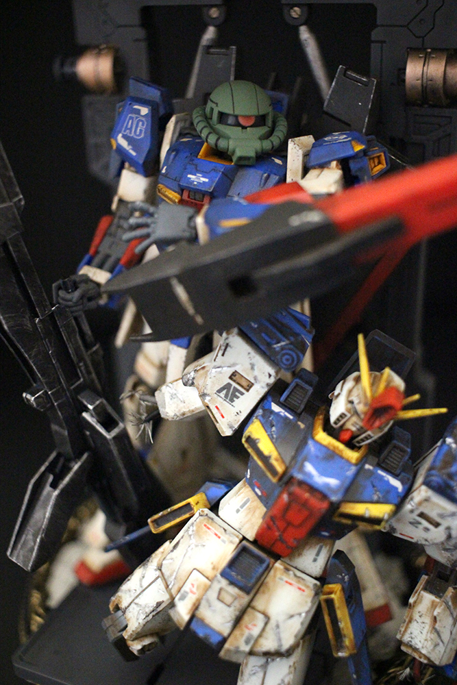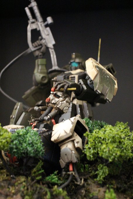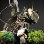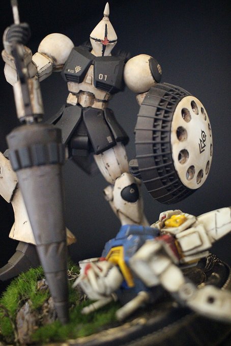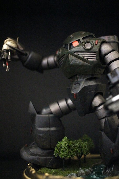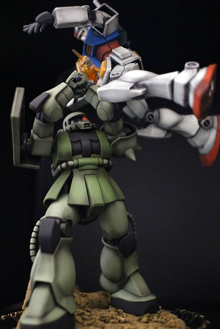 【今年の模活その4】 ザクを主役にしようと思い付きで作業した構図。ガンダムマーカーだけで陰影つけたんだけど、結構うまくいった感じ。自立させるの大変だったなw #ガンプラ #今年作ったプラモ晒そうぜ #今年作った模型晒そうぜ