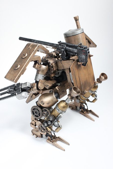 【完成っ】 おはようございます。 ティエレン君…だったものが完成w スチームパンク風ってことで歯車を露骨に貼り付けて、動力は蒸気機関ってことでタンクと煙突をつけてみました。 #ガンプラ #ガンプラはどんな発想で作ってもいいんだ #ガンプラの画像を貼るとRTされると聞いて