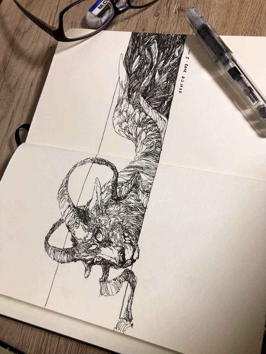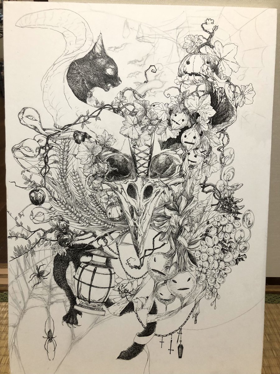 ぽちぽち描き込み、、、。 描きながら、下書きの方も描き変えまくるので、最終的にどうなるのか、全くわからん、、、(°_°) #ペン画を流してペン画民を増やそう #イラスト好きな人と繋がりたい