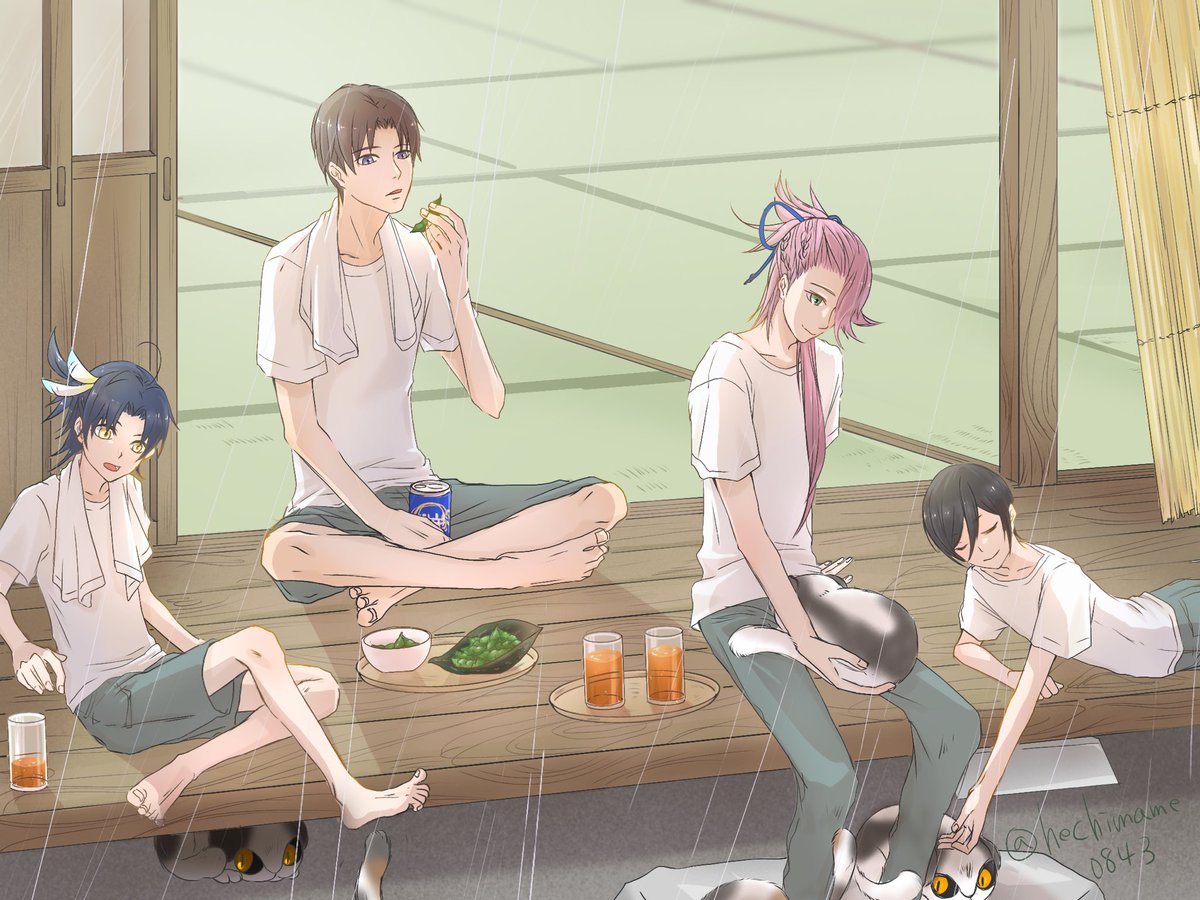 夕立と雨宿り 夕涼み中の男士と雨宿りに来た珍客です☺️