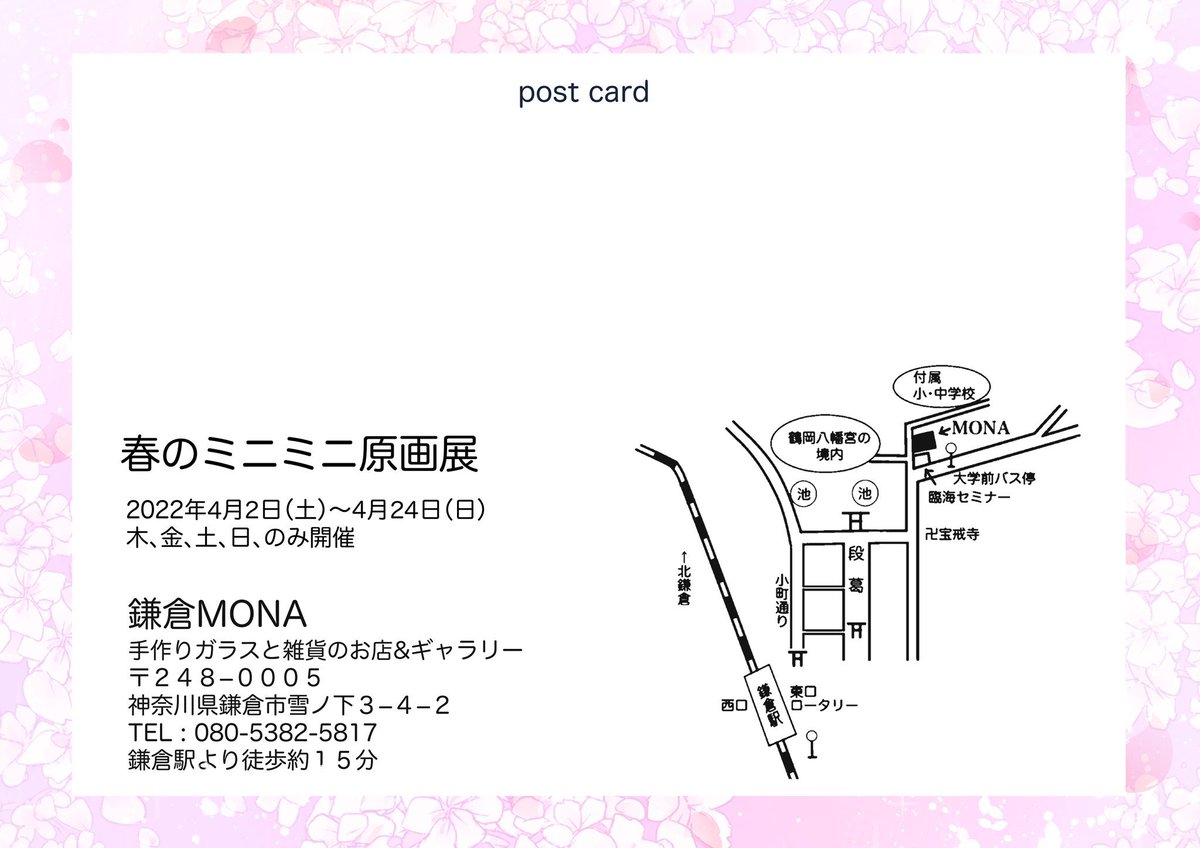 9 18 明日からの展示会のお知らせ 鎌倉MONA様(@kamakuramona ) 🌸春のミニミニ原画展🌸 ●開催日:4/2〜4/24 (期間中の木〜金、祝日のみ開催します) ●時間:11時〜17時 ●額装原画:2点 ●物販:缶マグネット、色紙ドローイング お近くの方は是非✨遠方の方は通販対応もありますので宜しくお願い致します✨ 22/04/01 23:32