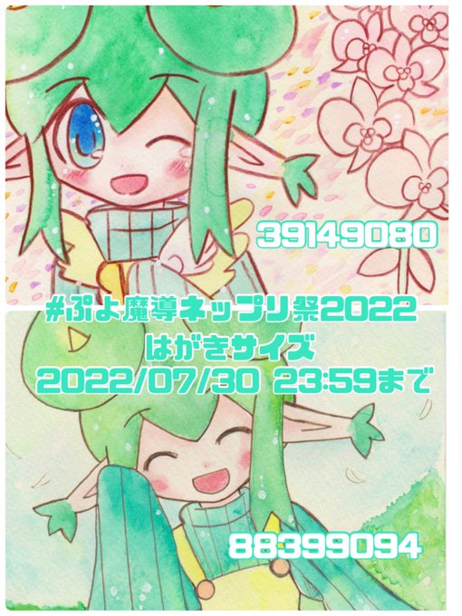 10 22 初参加失礼します。過去絵ですが登録しましたので是非…✨ 試し刷りしてL版は色が飛び過ぎて駄目だったのではがきサイズのみのご用意です💦(セブンイレブンで印刷できます) #夏のぷよ魔導ネップリ祭2022 22/07/23 14:35