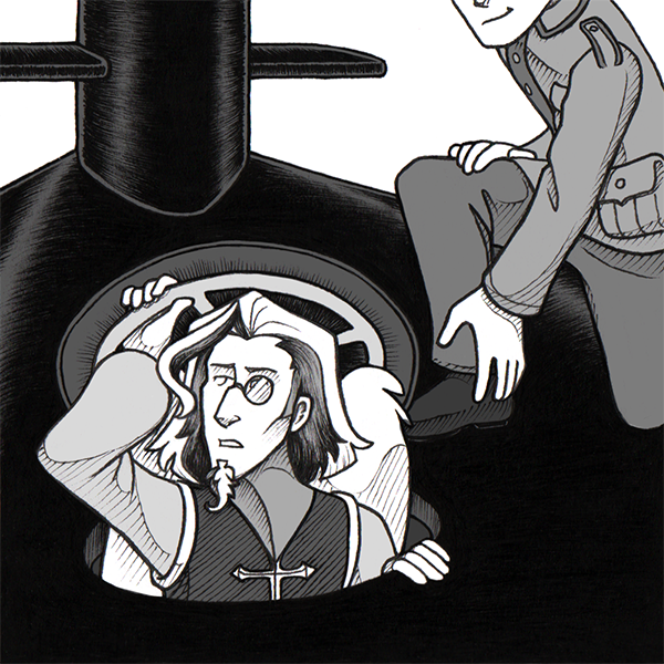 16th KNItober theme : submarine Nathaniel met a very powerful and absurd Entity in hopes of helping his friends. On a german submarine, yes. #OCtober #Drawtober #Drawtober2020 #Inktober #Inktober2020 #OEtherium #BlackAndWhite #Nathaniel