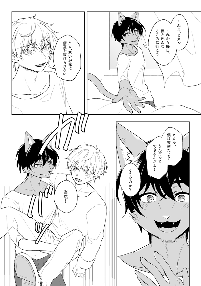 病気で色の分からない「ヒカル」 余命の短い彼の前に降り立ったのは 真っ黒な翼の黒猫天使だった ヒカルを天国に連れて行くはずの天使は 彼に恋をしてしまい…!? 4/3 #JGARDEN53 新刊「天使の夢」 の05b #獣人サークル「HEMOMO」新刊です! #J庭53 #創作BL 通販 hemomo.com/shop/