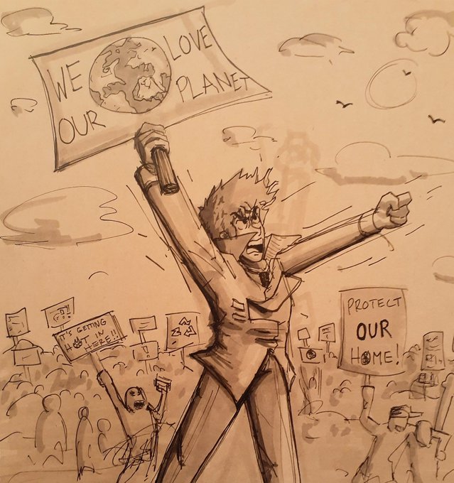 1 5 Spike 29/31! Spike fights climate change 🌎🌍🌏 suggested by my OG art teacher #inktober2019 #inktober #spiketober #cowboybebop #climatechange #protest #savethisplanet #itsgettinghotinhere #globalwarming #toons #ink #pen #inkdrawing #pendrawing #drawing #sketchbook 19/10/30 05:56