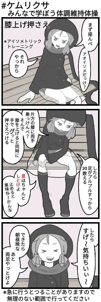 77 149 1都3県に緊急事態宣言が再発出されました。 不要不急の外出自粛が求められると運動不足が懸念されますので、ちょっとした運動を、思い出した時にでも、再掲ですがよろしければ是非~ #ケムリクサ健康班 21/01/08 07:58