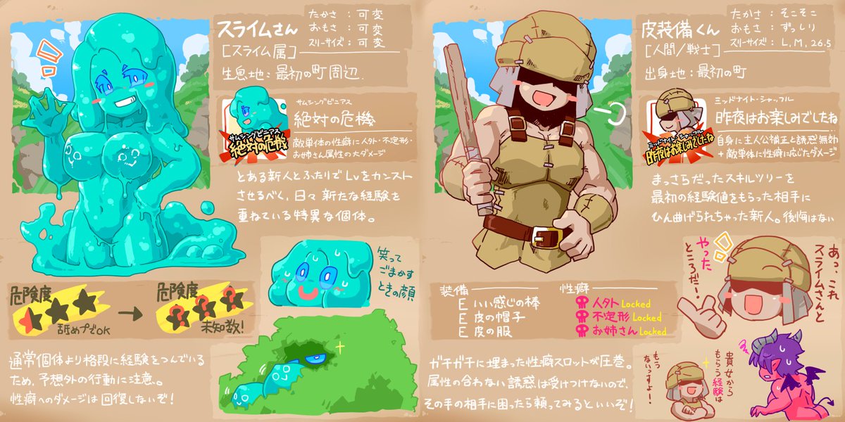 16 39 #今月描いた絵を晒そう 今月はほぼほぼ蛮族さんたちとスライムさんくらいじゃないかなー。 ……見事に運動部の弁当みたいな色合い。 22/03/27 22:14
