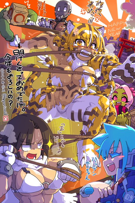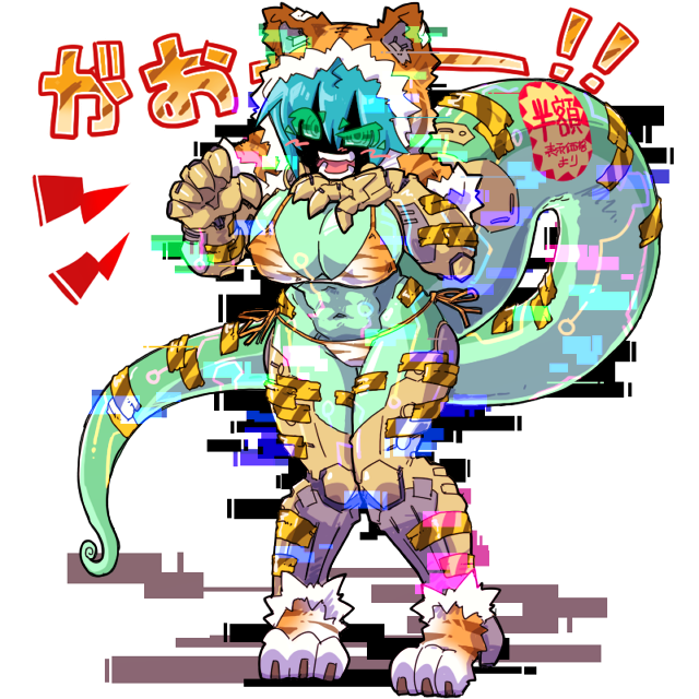 23 60 去年も牛柄ビキニの描き納めカメレオンちゃんでやったなーと思って今年も虎柄の描き納めはカメレオンちゃん。がおー 22/12/31 00:49