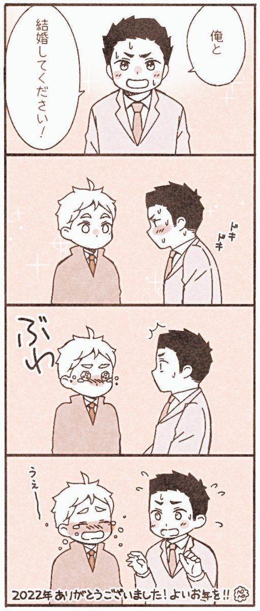28 107 描き納め!デ…プリ見て、スガさんも大地さんにプロポーズされたら、安心と嬉しい極まって大号泣してしまうタイプだったらめんこいなあと思った大菅です。2022年もありがとうございました。よいお年を😊#大菅月間 22/12/31 12:00