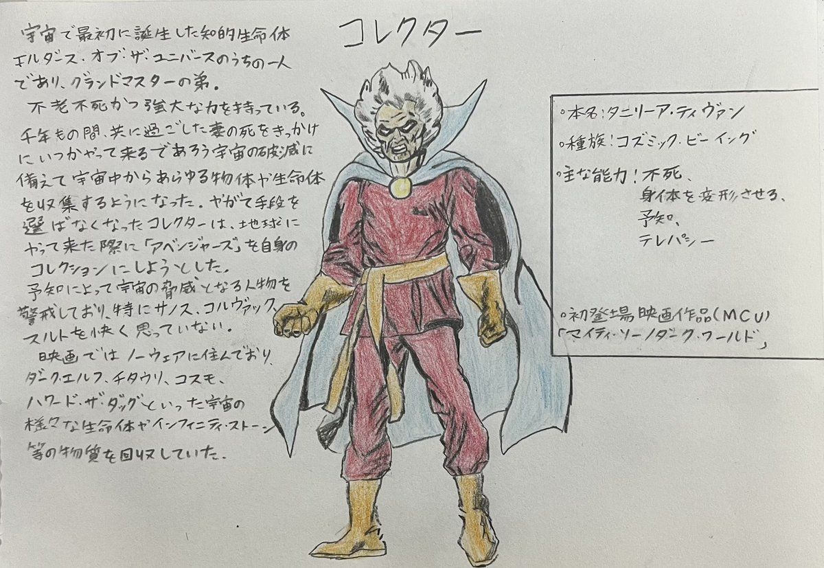 手描きMCUヒーロー列伝コレクター ・本名:タニリーア・ティヴァン ・種族:コズミック・ビーイング ・能力:不死、変形、予知、テレパシー ・初登場映画作品(MCU) 『マイティ・ソー/ダーク・ワールド』 #marvel #illust #芸術同盟 #絵描きさんと繋がりたい #みんなで楽しむTwitter展覧会