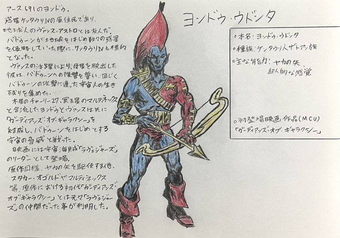 手描きMCUヒーロー列伝ヨンドゥ・ウドンタ ・本名:ヨンドゥ・ウドンタ ・種族:ケンタウリ人 ・能力:ヤカの矢、超人的な感覚 ・初登場映画作品(MCU) 『ガーディアンズ・オブ・ギャラクシー』 #marvel #illust #芸術同盟 #絵描きさんと繋がりたい #みんなで楽しむTwitter展覧会