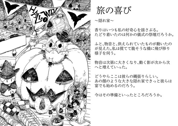 自創作「旅の喜び」 ハロウィンに合わせて絵本風の何かを作ってみました。 ネットプリントで印刷もできるようになってます。見てくれたりプリントしてくださったら嬉しいです。 番号 絵本風の(A4):K6R5Z4FP おまけ(L):69FPYNKD #ペン画 #創作 #ペン画を流してペン画民を増やそう