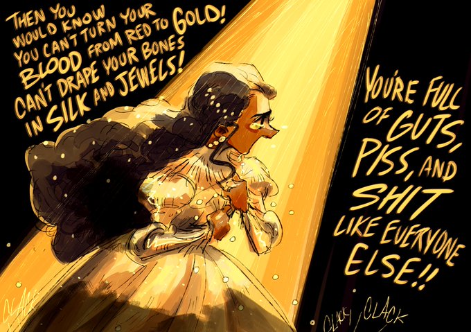 clarette, my bard, had a public meltdown on stage when she thought she heard someone in the audience whispering and laughing at her. the spotlight followed her. this was her Backstory that made her have to skip town for a while out of sheer embarrassment #DnDcharacter
