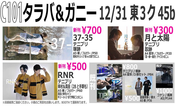 あなたのサークル「タラバ&ガニー」は、コミックマーケット101で「土曜日東地区 "ク " 45b」に配置されました!コミケWebカタログにてサークル情報ページ公開中です! webcatalog.circle.ms/Perma/Circle/1… #C101WebCatalog 受かってました。テニスで塚跡とか幸真あたりのまとめとか出したいっす🎾