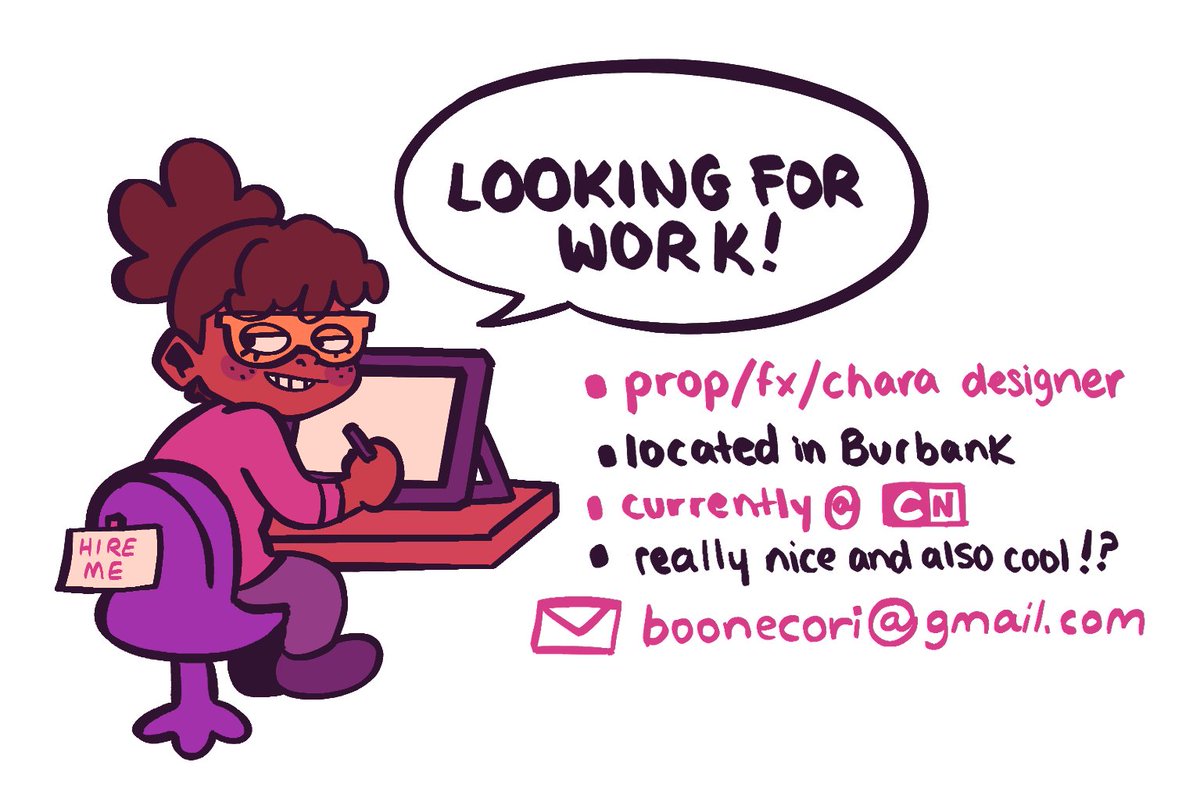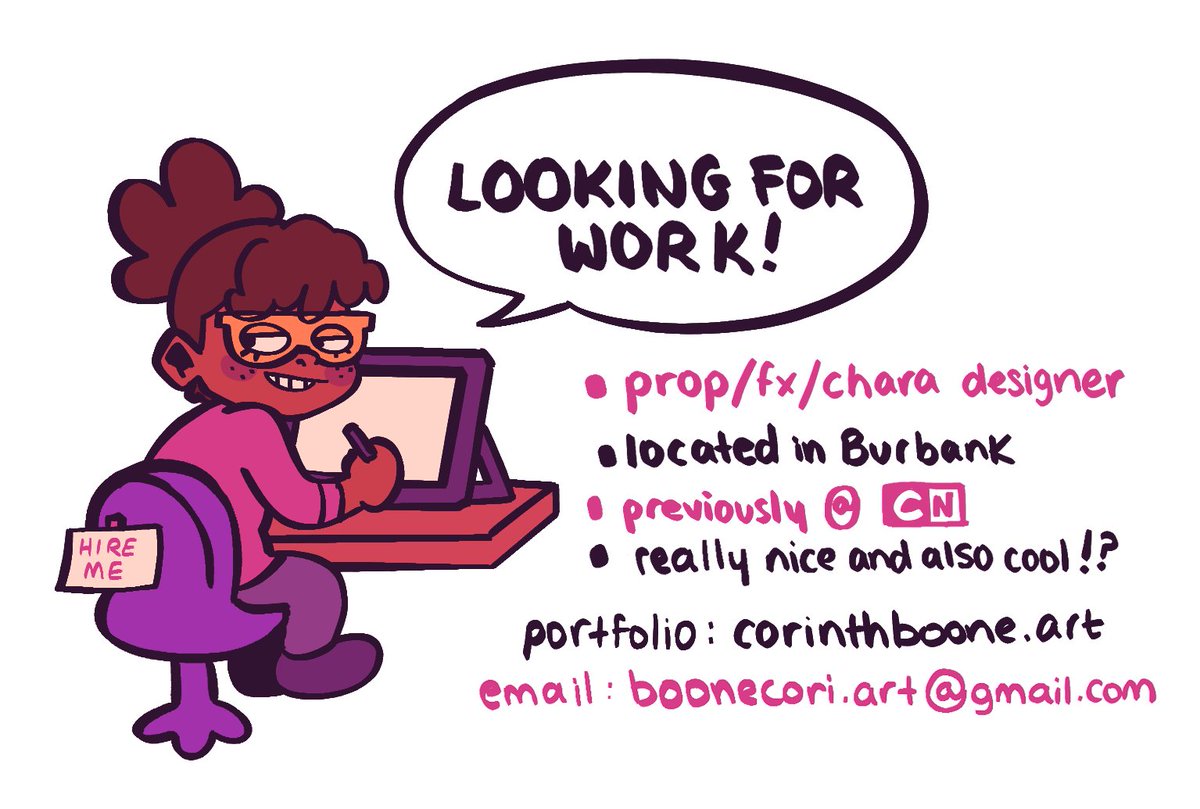 Hello #PortfolioDay , I'm Corinth! 👋🏾💕 My job at CN is wrapping up in March so I'm looking for full time (or freelance) work. If you need a prop/character designer then shoot me an email! 🌐 corinthboone.art 💌 boonecori@gmail.com Thanks and have a great day! 🎀