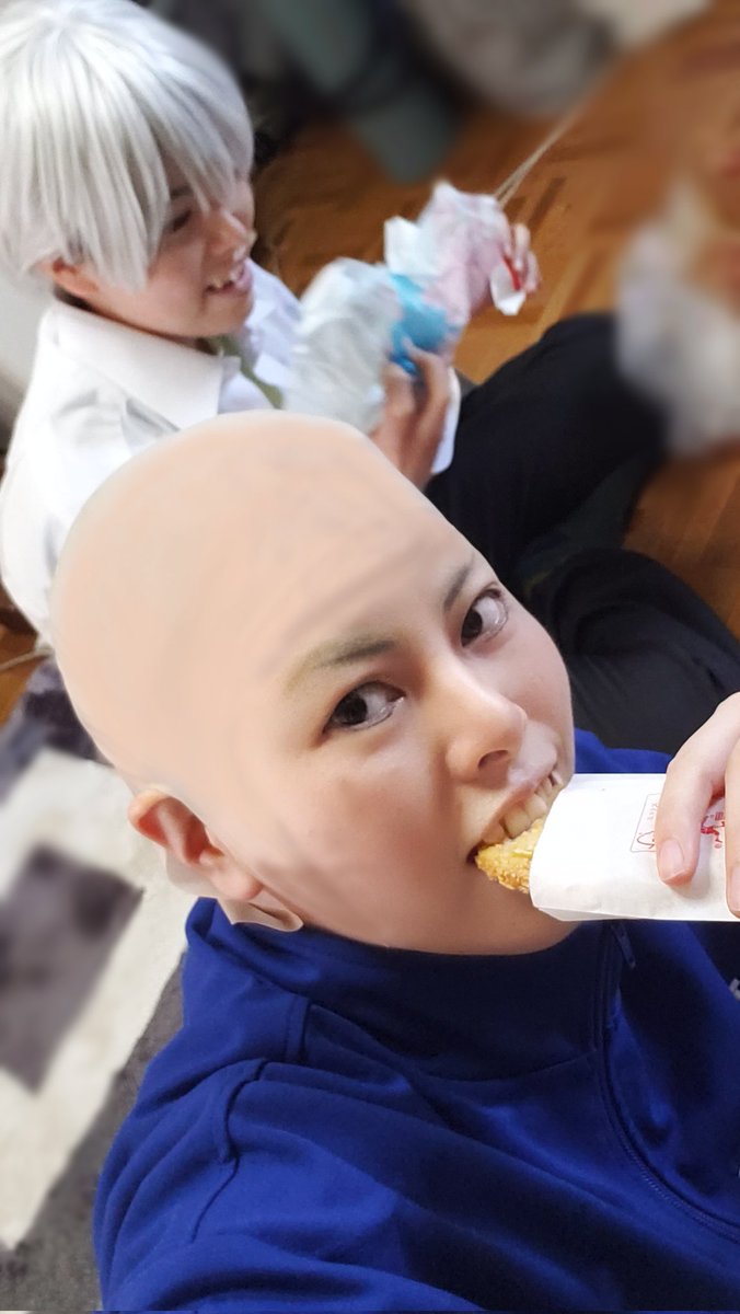 (コスプレ注意) 今日は宅コスしてました。 灼🦛の畦道相馬。 人生初のハゲヅラ。。。めっちゃ加工必要だとは知っていたけど、ここまでとはな☀️ ウォッチに宵越くんやってもらった!!マック食べて喜んでるヨイゴシ!!!かわいいね!!