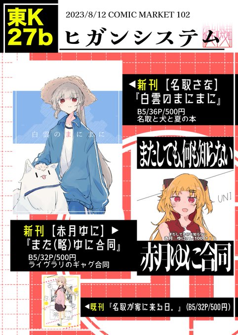 【C102 お品書き】 8/12(土) 東K-27b「ヒガンシステム」 新刊2冊、既刊1冊に加えて他サークルの合同にも参加してます(→リプツリー) 今回も全編通してvtuberの幻覚の漫画です 当日はよろしくお願いします🍆 通販: melonbooks.co.jp/detail/detail.… サークルページ: webcatalog.circle.ms/Perma/Circle/1…