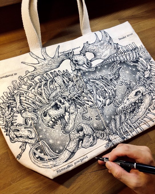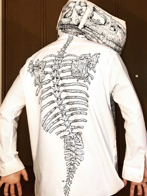 自分で描いておいてなんだけど背骨シャツと恐竜トートバッグ、カッコ良くない?