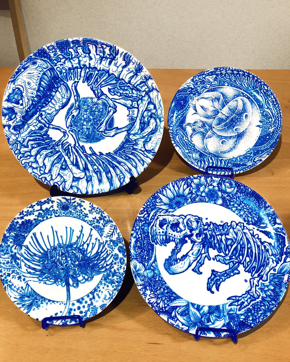皿の絵付け4枚セット完成しました〜! めちゃめちゃ可愛く描けてお気に入り🦖