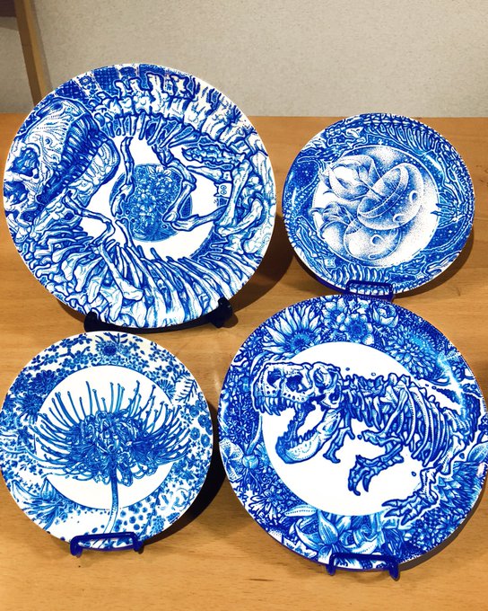 32 294 皿の絵付け4枚セット完成しました〜! めちゃめちゃ可愛く描けてお気に入り🦖 22/10/25 18:35