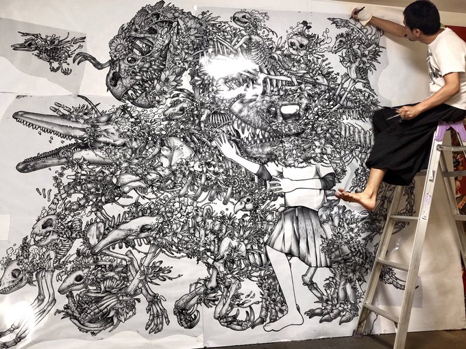 デザフェスギャラリーで無料で描けるスペースがあったので酔いながら友達と一緒に夢中になって壁に描きました、楽しかった なんかよく分からん細いスペースの一番下にあります