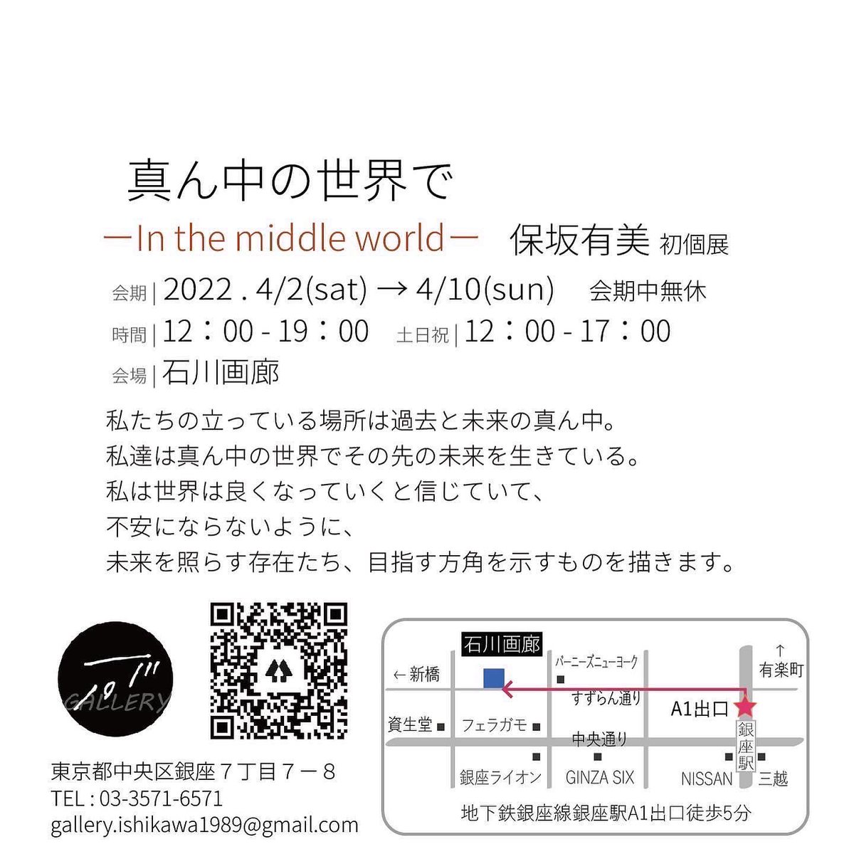 79 152 *拡散お願い 初個展に向けてご協力お願いします。 私の作品だけの空間を体験して下さい。 真ん中の世界で -in the middle world- 2022/4/2(sat.)-10(sun.) 平日12:00-19:00 土日祝日・最終日12:00-17:00 ※会期中無休 場所 石川画廊@IshikawaGallery *5、6日以外は在廊 22/03/28 14:04