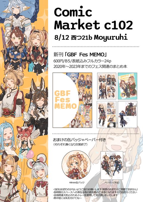 83 219 ■c102お品書き■ 2020年のオンライン開催~今年のEX名古屋までのグラフェス関連イラストまとめ本です (全文Twitter公開済み、一部加筆修正) おまけで缶バッジ+ペーパー(予定)がつきます! 缶バッジはペパより少な目です 23/08/09 23:31