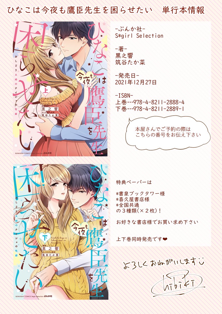 『ひなこは今夜も鷹臣先生を困らせたい』 単行本になります!😊 仏頂面の夫をあの手この手でふにゃふにゃにしようと奮闘する新妻の日常系ラブコメです☺️❣️ 12月27日、上下巻同時発売🤗 本屋さんだと特典ペーパーがつくよ💛 ↓Amazon -上巻- amazon.co.jp/dp/4821128888/… -下巻- amazon.co.jp/dp/4821128896/…
