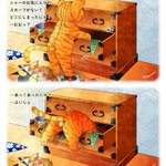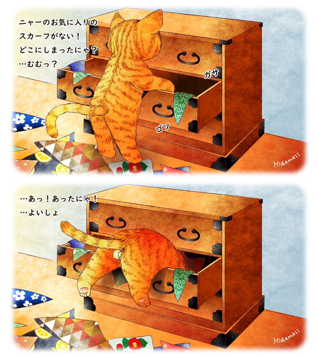 『お気に入りの夏用スカーフ』 茶太郎「ニャーのお気に入りのスカーフがない!」 #猫好きさんと繋がりたい⠀ #絵柄が好みっていう人にフォローされたい #猫イラスト #創作イラスト #イラスト #もうみんな猫になればいい #今回も丸見え #和箪笥 #鏡の前でポーズ