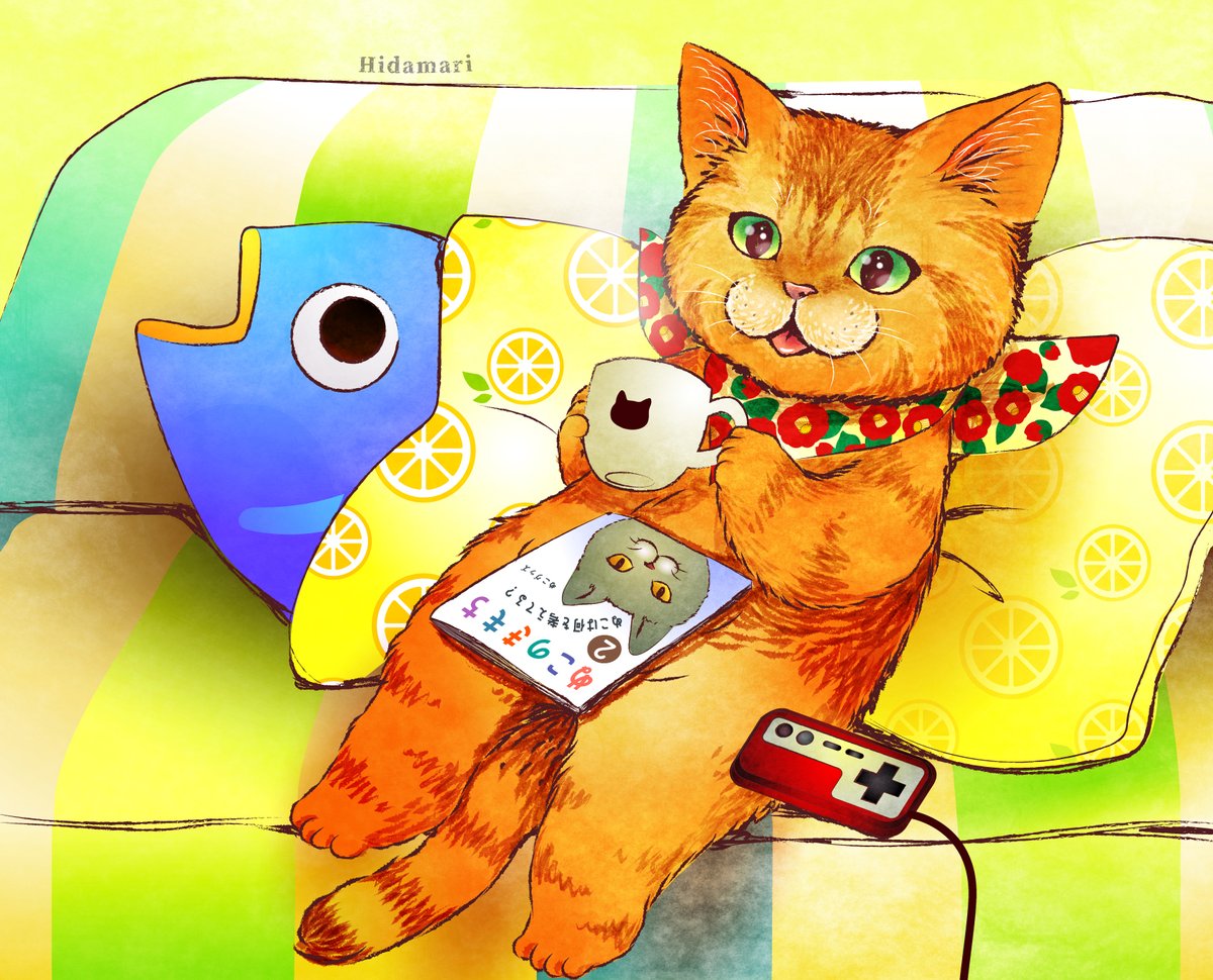 『楽園の猫』 茶太郎 「にゃむ…風が気持ちいいにゃ。 この景色…宝物だにゃ。 青空、太陽、湖、緑、風…世界は皆に平等にゃ。 …ん?地中海?…うんにゃ、日本だにゃ。 ニャーのお気に入りの場所にゃ」 #イラスト好きな人と繋がりたい #イラスト #illustration #猫 #カフェ #無名絵師
