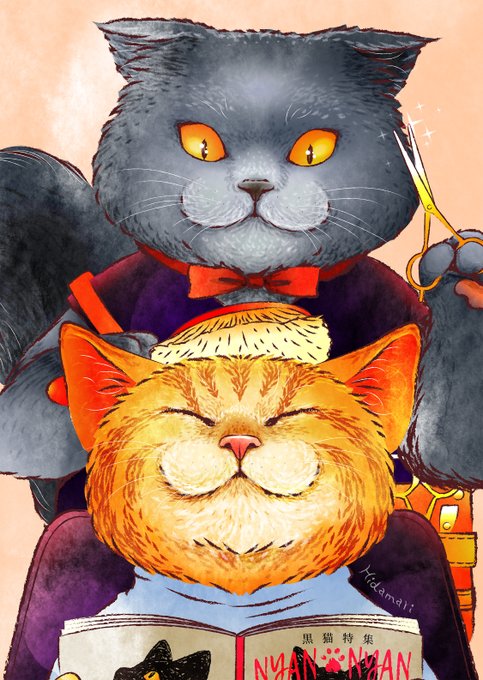 『猫の床屋』 店長「ブラッシングしますね」 茶太郎「頼むにゃ」 茶太郎「その金色のハサミ、凄く綺麗だにゃ」 店長 「そうでしょう、そうでしょう。 私、金色が好きなんですよ」 茶太郎「やっぱり猫は光物が好きにゃ」 店長「ですねぇ」 ⠀ #絵柄が好みっていう人にフォローされたい #イラスト