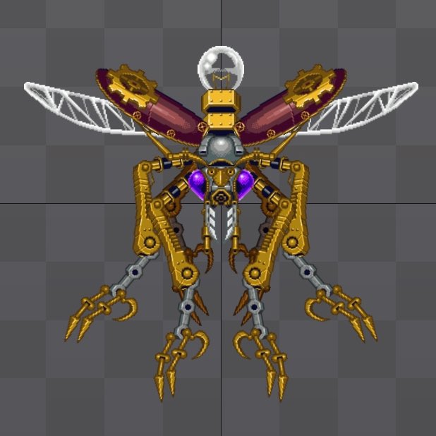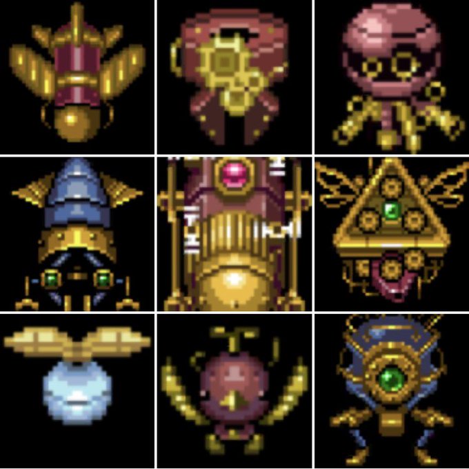 8 31 尻尾の電球が弱点なので、翼を切り替えて倒します。 このボスは羽の羽ばたきや動作など、個人的に好きな感じに出来ました。 画像は今回初出しですが、そんな内容を過去にツイートしています。 いつかどこかで活躍できたらいいな。 #ドット絵 #スチームパンク #pixelart 22/04/22 00:15