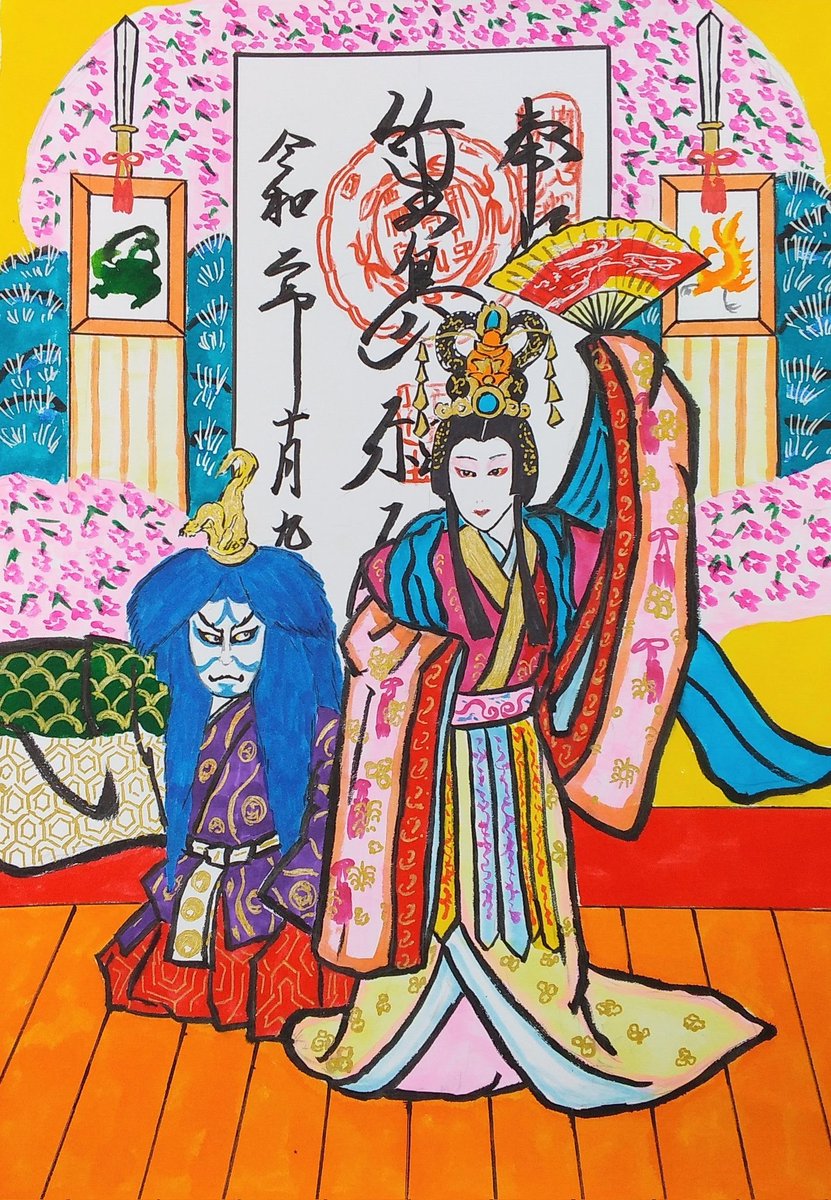 【竹生島】(ちくぶしま) 琵琶湖に住む弁財天と龍神の物語。 弁財天が来臨して妙なる舞を見せ、龍神は勇ましさを示し、衆生済度・国土鎮護を誓い、めでたい舞を披露する。 やがて弁財天は社殿に、龍神は龍宮へと帰ってゆく。 ●背景:竹生島神社の御朱印、両側に神社の四神旗✨ #イラスト