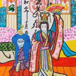 43 406 【竹生島】(ちくぶしま) 琵琶湖に住む弁財天と龍神の物語。 弁財天が来臨して妙なる舞を見せ、龍神は勇ましさを示し、衆生済度・国土鎮護を誓い、めでたい舞を披露する。 やがて弁財天は社殿に、龍神は龍宮へと帰ってゆく。 ●背景:竹生島神社の御朱印、両側に神社の四神旗✨ #イラスト 23/08/01 19:07