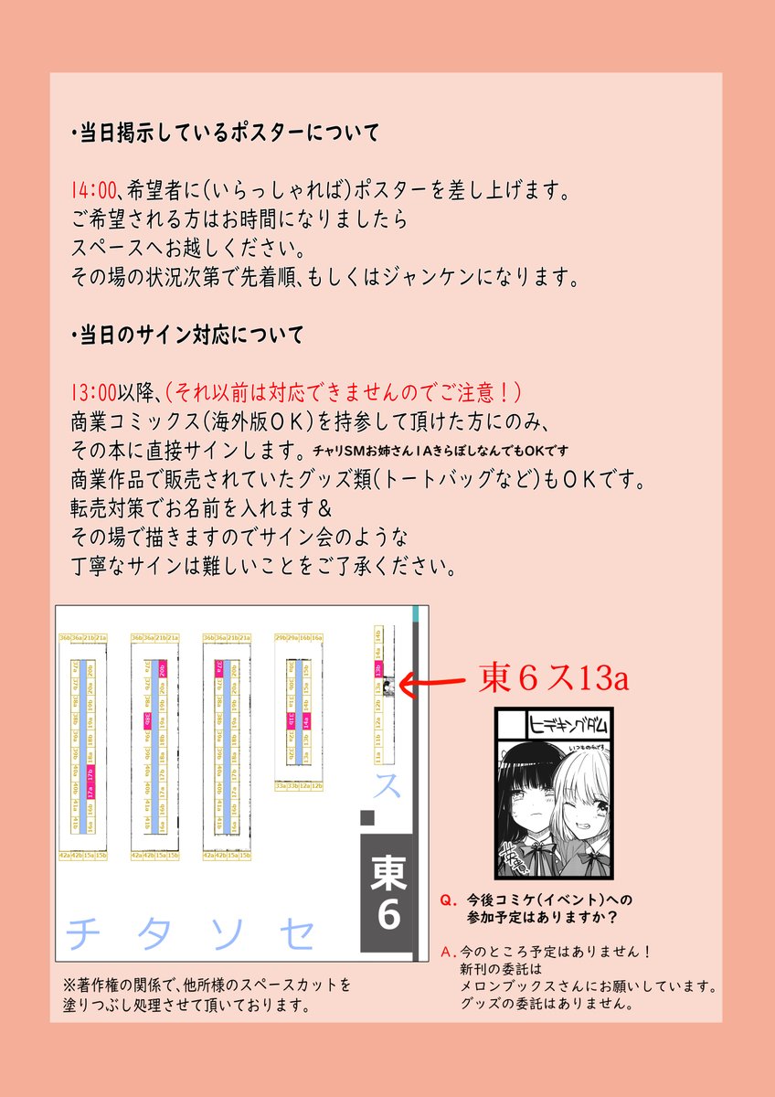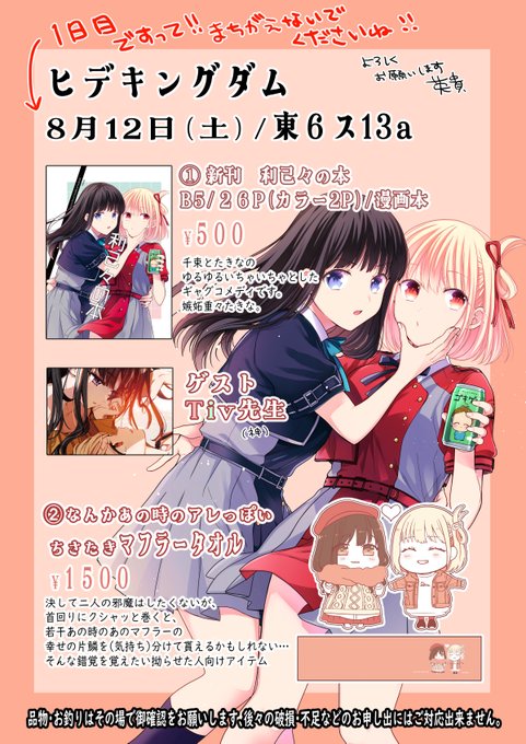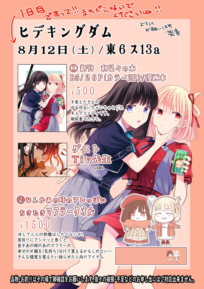 C102お品書きです! リコリコです、よろしくお願いします! 【サークル】ヒデキングダム 【参加日】8/12(土)1日目 【スペース№】東ス13a 【新刊委託】melonbooks.co.jp/detail/detail.…