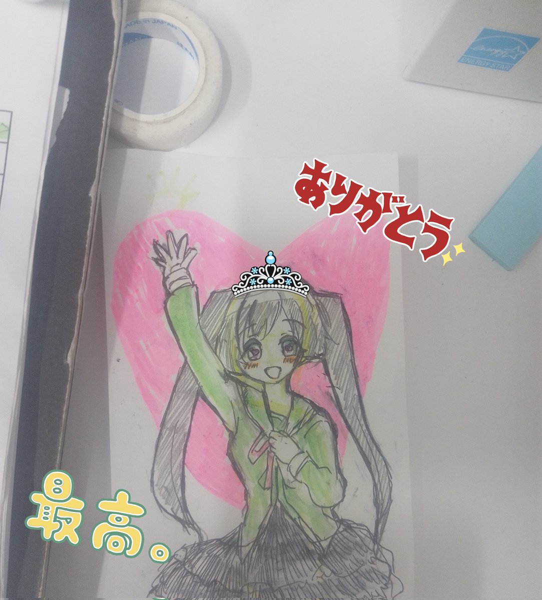 おちフルへ、「ありがとう」……それしか言う言葉が見つからない…… これはらくがきしたへもちゃん。消しゴムかけたらボールペンが荒ぶりすぎて線が汚くなってごめんねへもちゃん #おちフル #おちこぼれフルーツタルト #ochifuru