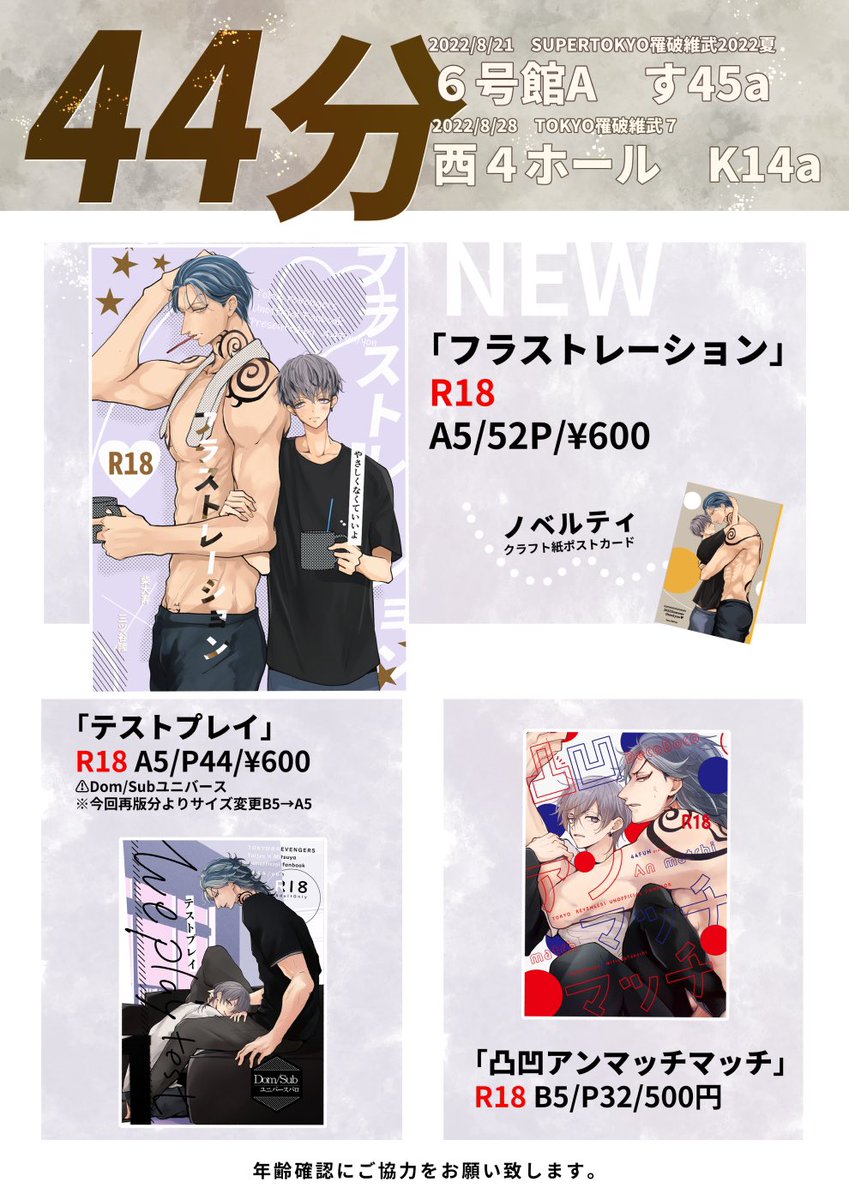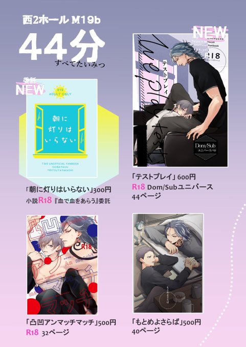 TOKYO罹破維武5 お品書きです❣️ 全てたいみつ💙💜 無理さんの小説委託させて頂きます〜✨(詳細後日) 各サンプル… 新刊「テストプレイ」pixiv.net/artworks/99208… 「凸凹アンマッチマッチ」pixiv.net/artworks/96259… 「もとめよさらば」pixiv.net/artworks/89240… どうぞよろしくお願い致します🙇✨