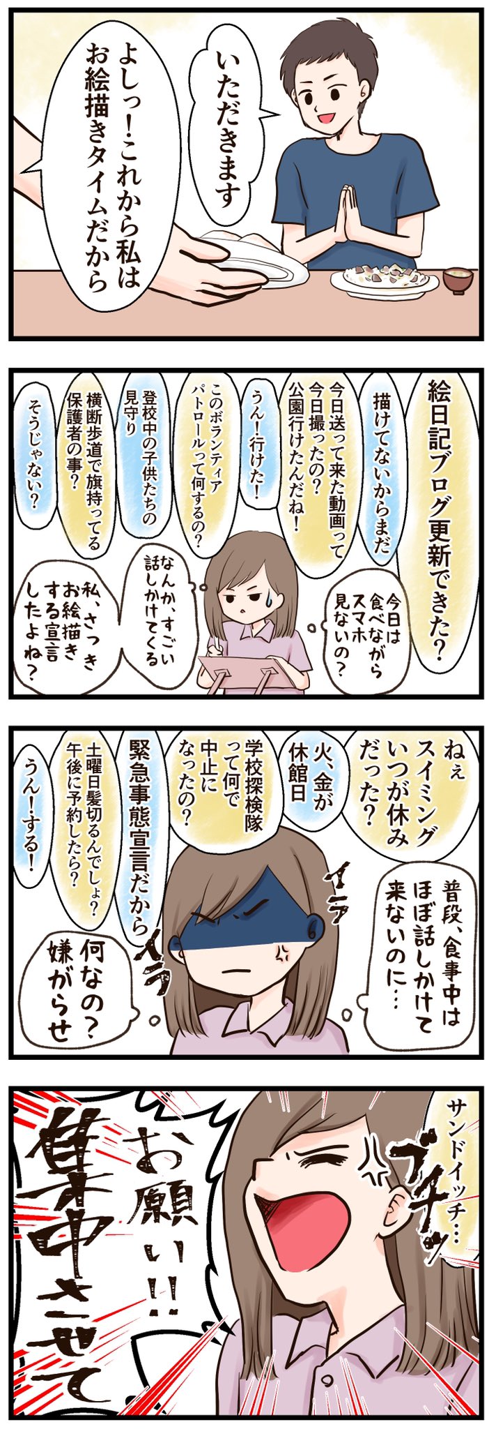 【過去漫画:集中したい時に限って話しかけてくる】 お絵描きタイムって宣言したのに、いつでも話せる事を話してくるの何で? 空気読んで、お絵描きに集中させて! #育児絵日記 #育児漫画 #4コマ #漫画が読めるハッシュタグ