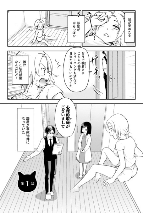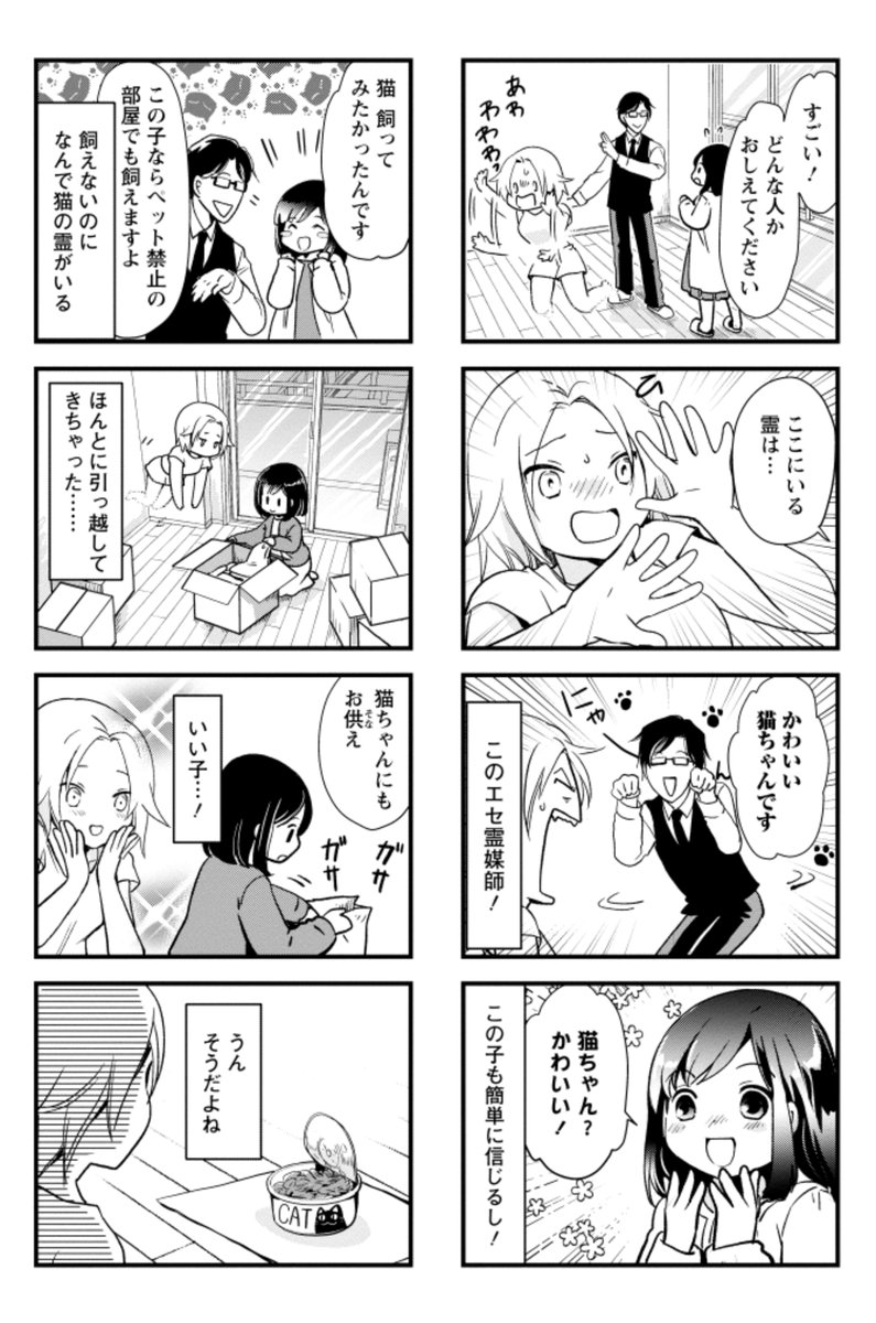 猫憑き事故物件だと聞いて入居したら必死で猫のフリする女の子の地縛霊がいた4コマ漫画 『あの世で猫になる 』3月9日電子書籍で配信です 1話(1/2) #漫画が読めるハッシュタグ amzn.to/3KTy92F