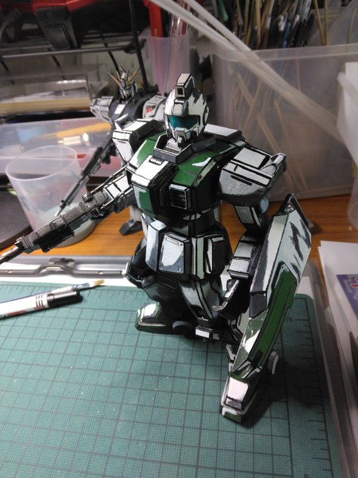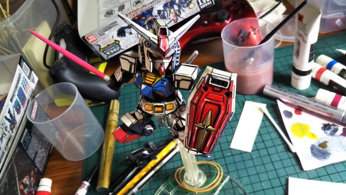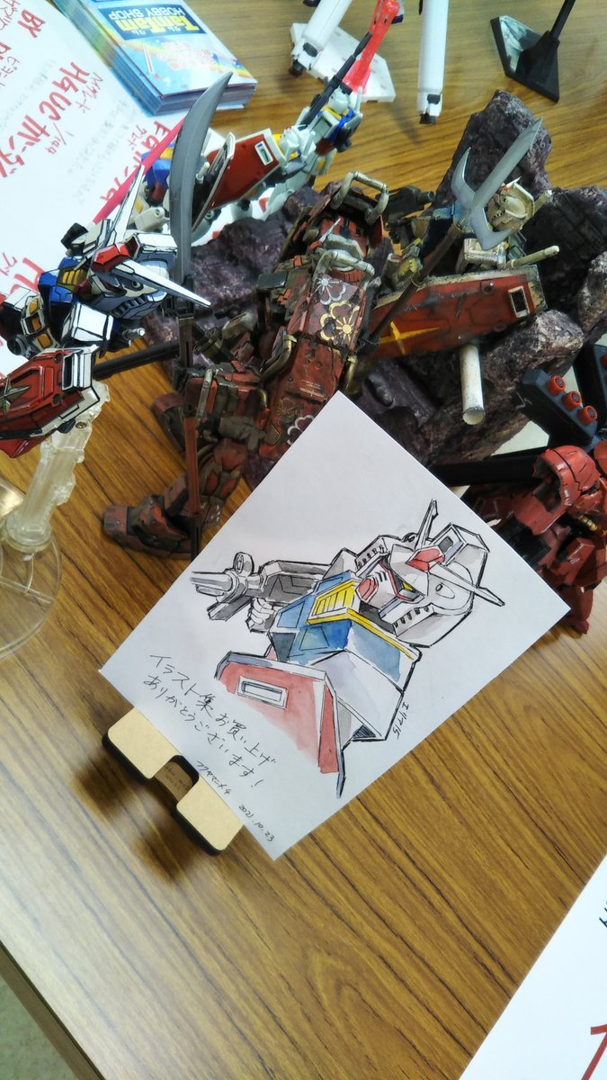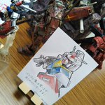 サークルさんに描いてもらった #ガンダム をうちのガンダムの横に飾らせてもらいました!!ありがとうございます!! #コミックフォーチュン #ComicFortune #フクヤマニメ #ガンプラ パッチ当てたのでやっと画像付きツイート出来るようになったかな?
