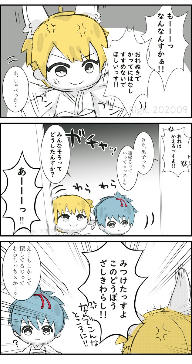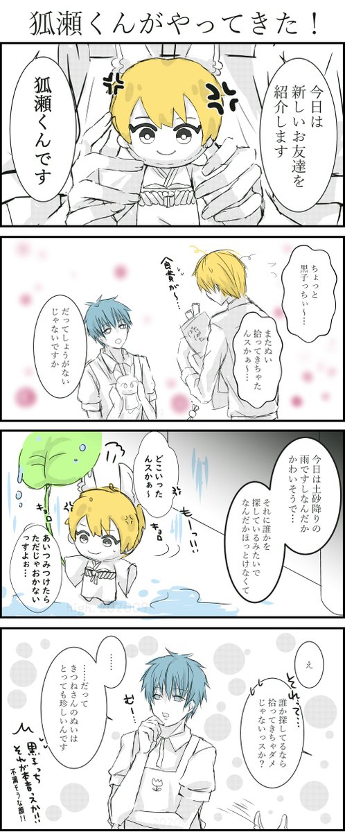狐瀬くんがやってきた! pixiv.net/artworks/84301… ぬいの(おやつの)なわばり pixiv.net/artworks/84833… 懐かしいやつです。☺️ 初期に描いた狐瀬くんはツンキャラだったけど、今じゃぼっちの隠居おじいちゃんみたいな落ち着きが… 黒子っち(人間)のぬい拉致癖は変わってません😌
