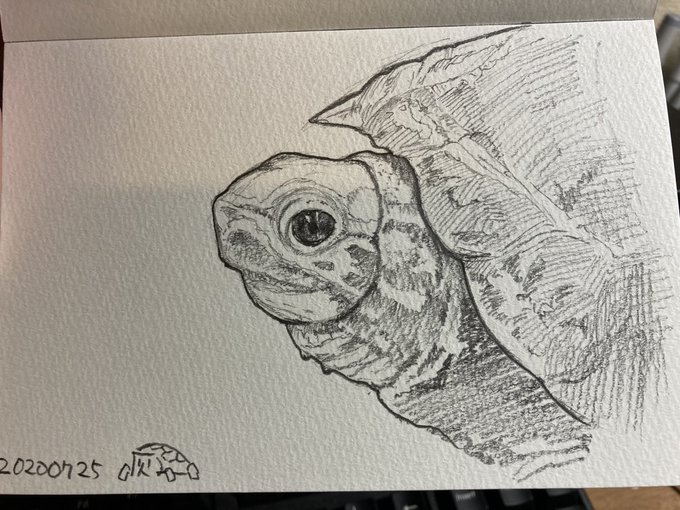 3 16 妻の知り合いには亀に縁のある人が結構いる。話題に上ったので描いてみたけど、亀むずいなー。 20/07/25 16:55
